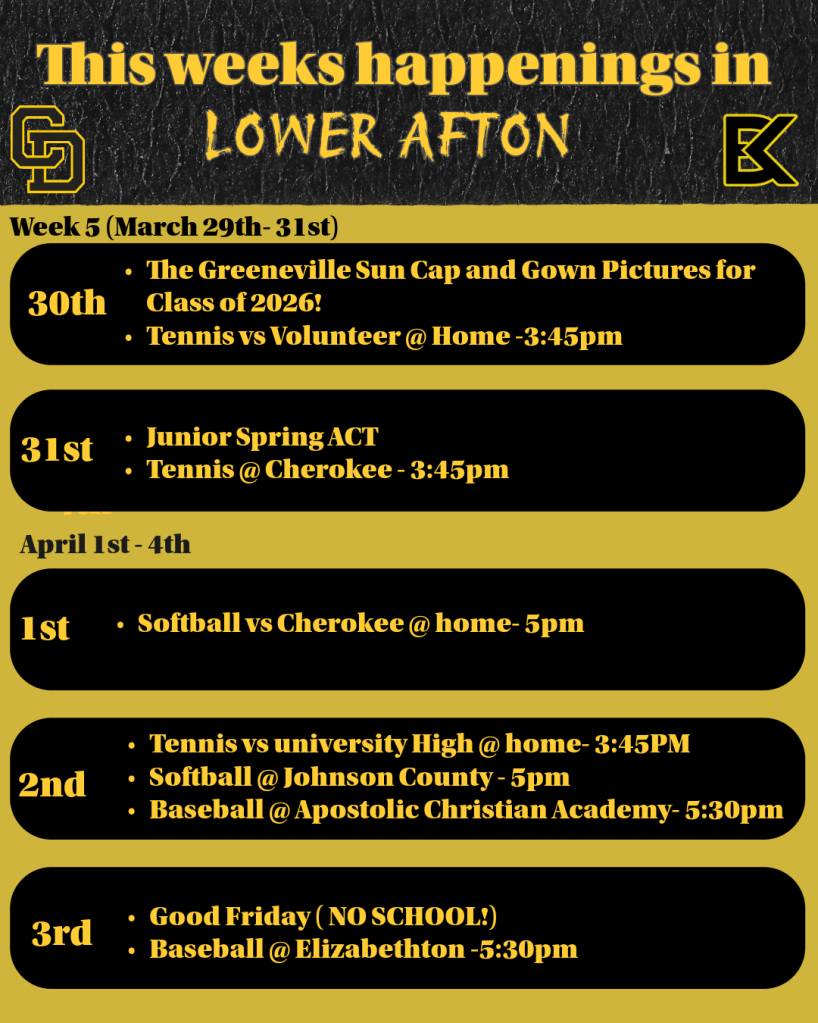 Juniors will be taking their Spring ACT on Tuesday, March 31st, 2026. Students taking the ACT are allowed to leave after they are finished with their ACT, given that they have a SIGNED NOTE from a parent or guardian. Students ARE NOT allowed to leave with other students when leaving campus early. Students should arrive no later than 7:45am the day of, to get themselves situated and in the correct classroom for their test. Admin will inform them of where to go in days prior to their test.